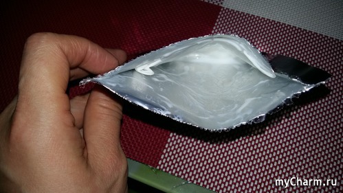Упаковка очень легко открывается, для этого не понадобятся ножницы или еще какие-то приспособления, так как сверху есть небольшая насечка для того, чтобы открыть упаковку. После вскрытия упаковки из нее доносится очень приятный нежный аромат. А внутри упаковки находится сама маска, аккуратно свернута и пропитана очень хорошо, массой очень похожей на белоснежный крем
