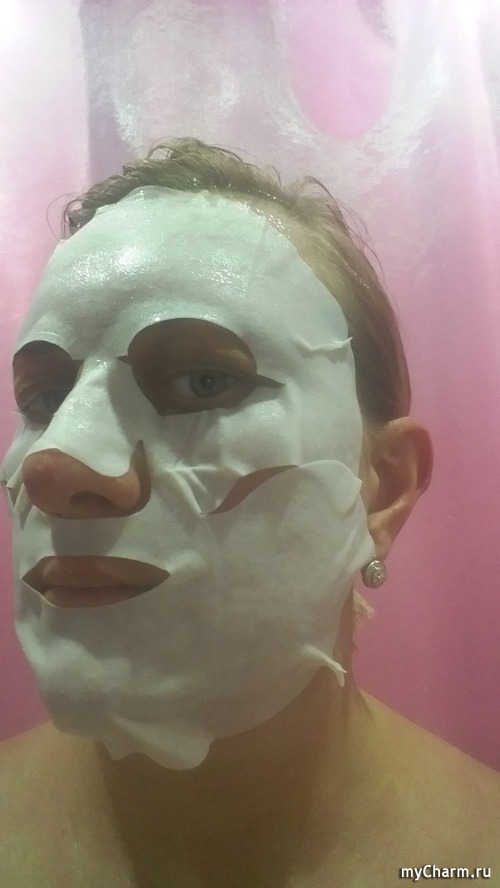 Прежде чем нанести маску на лицо, кожу я предварительно очистила своим привычным средством для снятия макияжа и тогда уже использовала маску. Остатки массы, которой пропитана маска, и они остались в упаковке и не мало, я их извлекла рукой и нанесла на шею, так как самой маски хватает только до подбородка. Держала я ее около 20 минут, как и рекомендует производитель. Никаких неприятных ощущений или дискомфорта я не испытывала. Но во время использования маски лучше всего лечь и расслабиться. После того, как время прошло, маску снимаю, все содержимое маски впитывается за это время в кожу очень хорошо, так как маска практически становится сухой и сама спадает с лица.