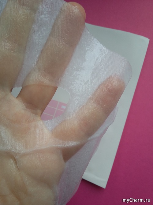 Итак, использовать продукт нужно предварительно очистив кожу. Маска тканевая, её основа изготовлена из натуральных и безопасных волокон. Ткань мягкая, комфортная, хорошо фиксируется на лице, плотно прилегает к коже и не "ездит".