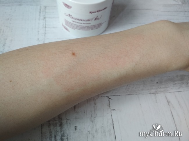 Как уже отметила выше, в составе средства имеется как порошок корицы, так и ее эфирное масло. Поэтому скраб-маска «Массажист (ка)» имеет очень сильный разогревающий кожу эффект. Кожа успела покраснеть за те несколько минут, пока делала снимки для обзора: