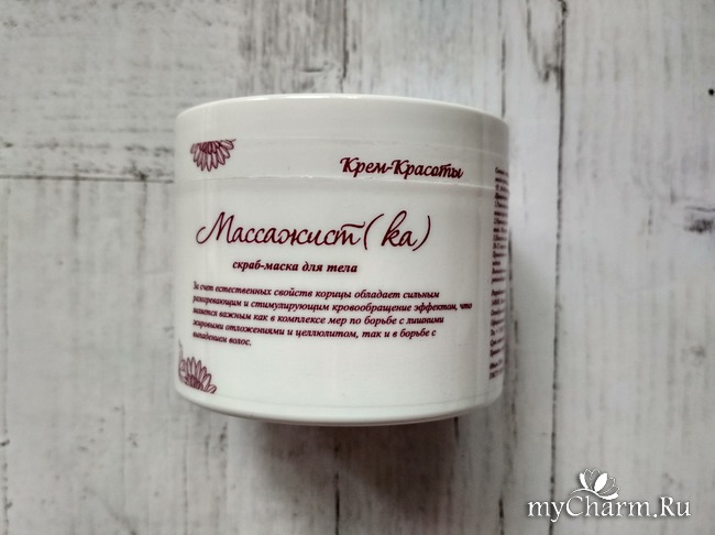 Скраб-маска «Массажист (ка)» представлена в небольшой баночке, объем которой составляет 250 мл. Изначально баночка защищена от вскрытий приклеенной этикеткой. Срок хранения средства составляет всего три месяца, ведь его состав полностью натурален. Все компоненты в скрабе-маске применяются в уходе как за волосами, так и за телом. Например, экстракты водорослей (фукуса и ламинарии) прекрасно укрепляют локоны, придают им блеска и предотвращают выпадение. В уходе за телом эти же составляющие устраняют дряблость, помогают разгладить и подтянуть кожу. Корица и ее эфирное масло ускоряют рост волос, а в уходе за кожей эффективно помогают в борьбе с целлюлитом: все это достигается благодаря разогревающим и стимулирующим кровоток свойствам этих компонентов. Белая косметическая глина отлично очищает и кожу головы, и кожу тела, тем самым способствует быстрой регенерации клеток. Именно поэтому применять скраб-маску «Массажист (ка)» можно тремя разными способами: