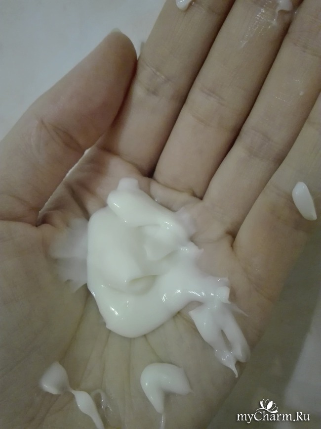 Объем пробника 7,4 мл, для разового применения как раз хватает одного пакетика. На вид маска очень густая как желе и маслянистая белого цвета.