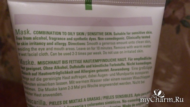 Держать маску следует 10 минут, затем смывать водой, а проводить подобные сеансы производитель рекомендует 2-3 раза в неделю. Благодаря этим действиям создатели обещают матовость и подтянутость кожи, а также по обещаниям компоненты средства успокоят и смягчат нежную кожу, очистят и освежат ее.