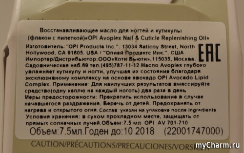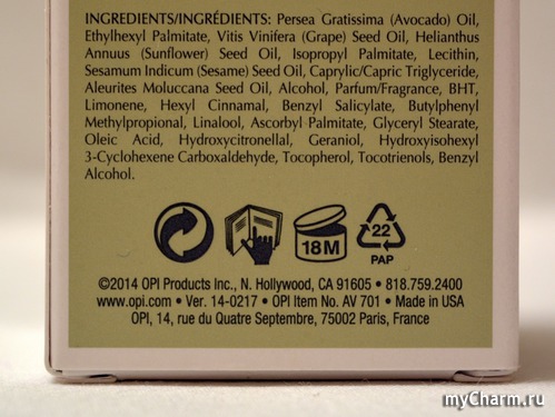 Содержится некоторое количество консервантов, которые способствуют сохранению Avoplex nail & cuticle Replenishing oil до октября 2018 г.