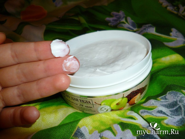 Достаточно набрать небольшое количество продукта, затем несколько секунд «погреть» в ладошках и нанести на кожу тела. Красивая теплая кремово-масляная консистенция легко скользит, хорошо и равномерно распределяется по поверхности кожи. Моментально чувствуется эффект увлажнения и приглушенный, просто сказочный, миндальный аромат! На теле абсолютно не остается никаких дискомфортных ощущений от излишней жирности масел, входящих в состав этого продукта.