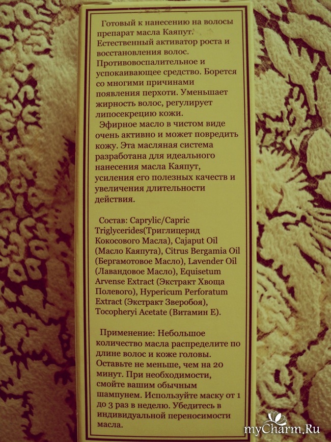 На помощь пришел люксовый шампунь от швейцарской компании, благодаря которому волосы практически перестали выпадать, но, как оказалось, одного средства недостаточно, требуется комплексный подход. Перхоти у меня нет, хотя периодами такое явление возникает, поэтому необходима профилактика. В общем, все необходимое из перечисленного я ожидала получить от многообещающего масла Каяпут.