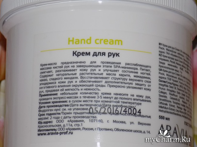 Объем баночки аж 550 мл! Это говорит о том, что такой объем средства будет идеальным для сотрудниц маникюрных салонов, салонов красоты, косметических салонов spa-процедур. Такую баночку, выполненную в дизайне, четко определяющем профессиональный вид уходовой косметики, всегда будет удобно и приятно поставить на свое рабочее место в салоне красоты.
