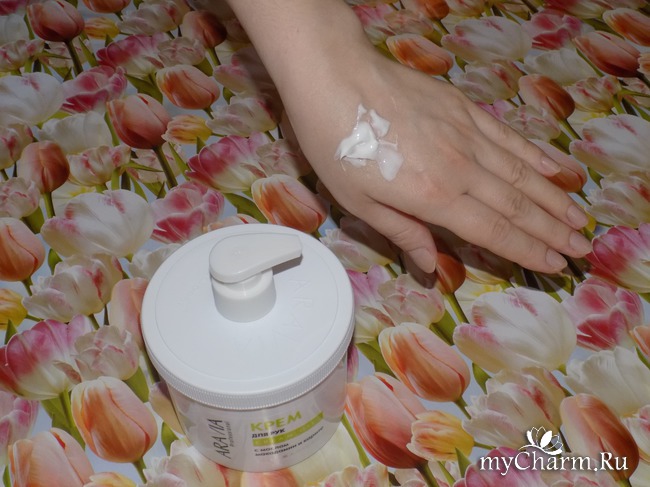 Очень импонирует то, что крем находится в баночке с конусом-дозатором на крышке. Это невыразимо удобно! Баночку сразу же поставила около рабочего стола и несколько раз в день просто выжимаю крем в ладошку через дозатор, буквально одной рукой, затем распределяю крем на обеих руках.
