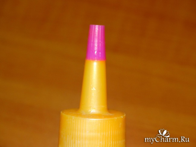 У флакона вытянутый узенький носик жёлтого цвета с малиновой крышечкой на конце.