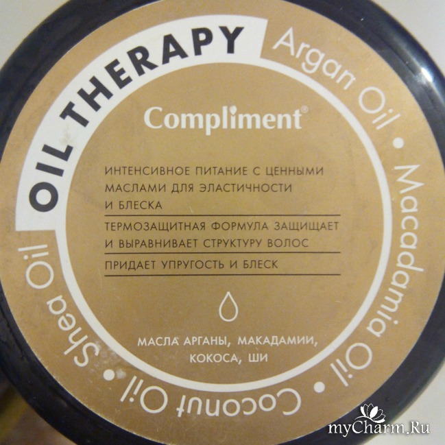 Содержимое маски упаковали в 500 милиллитровую банку желтого цвета. На крышке сверху есть информативная наклейка, по которой мы сразу понимаем, что главными компонентами этого продукта являются масла: арганы, макадамии, кокоса и ши. Я думаю, всем известны чудодейственные свойства масел, в маске от комплимент их целых четыре!