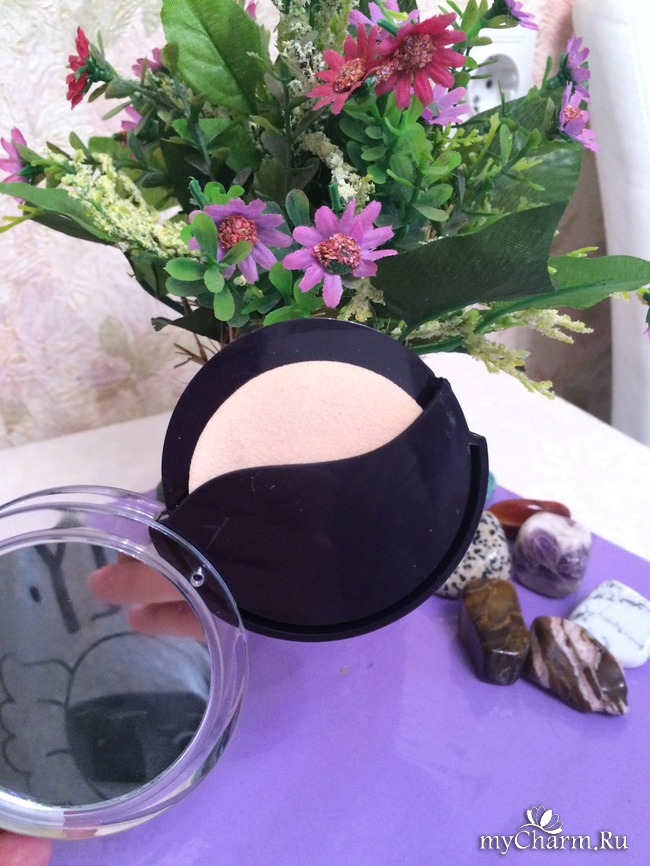 Итак, о дизайне пудры. Сразу скажу, он не универсальный, как у многих идентичных косметических средств. Верхняя прозрачная часть сделана из пластика и сзади имеется зеркало. Само средство интересно выдвигается вбок. На пудре красиво "выбиты" тюльпаны. На обратной стороне есть специальное место, в котором находится спонжик, который сделан из мягкого материала и не занимает много места. Небольшое неудобство составляет то, что необходимо постоянно переворачивать упаковку, так как само средство и зеркало находятся с разных сторон. Но, это не является существенным недостатком. Сама упаковка не очень плотно закрывается, и "разболтавшись" в сумочке, может открыться (выдвинуться), тем самым, запачкать все внутри.