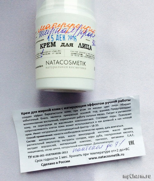 Тем не менее, крем не оставляет жирной или липкой пленки, а прекрасно впитывается кожей. Но вот что меня действительно удивило в действии данного крема, так это то, что кожа становится идеально матовой! Если после большинства кремов на лице некоторое время присутствует блеск, то в случае с кремом Натакосметик этого блеска нет! А только лишь матовая, бархатная кожа!