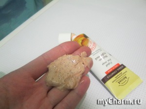 Первое, что приятно удивляет, когда открываешь тюбик со скрабом, это, безусловно, запах. Средство потрясающе пахнет. Вам точно придется по вкусу, особенно если вы сладкоежка. В аромате отчетливо различаются мягкие нотки шоколада, или даже скорее шоколадного масла, ну и, конечно, ощутим запах меда. Правда, немного в меньшей степени. Едва уловимы нотки абрикоса и облепихи. Все эти ароматы прекрасно сочетаются между собой. И вместе пахнут очень привлекательно. Вот уж воистину ароматерапия. Хочется если не попробовать ложечку скраба, то хотя бы лизнуть.