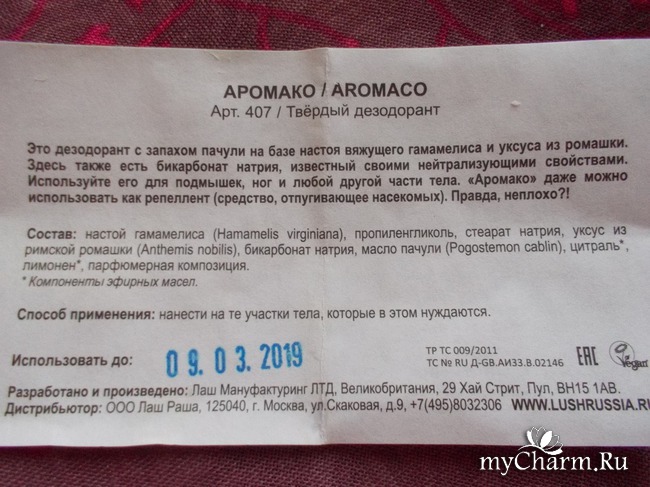 Это снова я и не одна, а с косметическим обзором на следующий натуральный твердый дезодорант по моему тестированию, который называется "Аромако" от английского бренда Lush.
