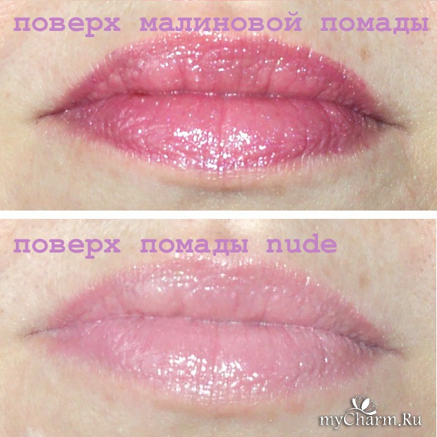 А вот поверх помады. Усиливает цвет помады, дает неплохое свечение. Но липкость сохраняется. И поверх обнаженной помады: