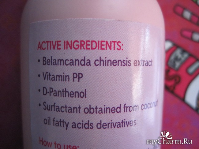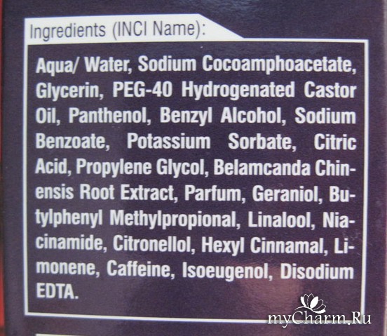 Помимо экстракта корня этого растения мицеллярка содержит витамин РР, Д-Пантенол, касторовое масло, глицерин. ПАВ, использованные в средстве, получены из жирных кислот кокосового масла.