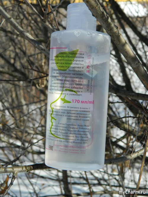 Перейдём к пластиковому флакону, в который помещается 170 миллилитров средства. Стенки ёмкости прозрачные: можно полюбоваться пузырьками, возникающими во время взбалтывания мицеллярки. Здесь же дублируется основная информация о продукте.