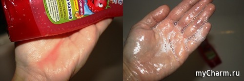 Средство малинового оттенка и достаточно жидковатое, похоже на фруктовый кисель. Стоит быть осторожней, чтобы не вылилось слишком много. Даже от небольшой капельки создается умеренная пенка. Аромат, конечно, потрясает. Детки наперебой стремятся понюхать открытую крышку перед применением. Стоит только нанести шампунь на волосы или тело, как ванная наполняется нежнейшим малиновым облаком со сладковатыми конфетными нотками. Вот уж точно яркая детская композиция.