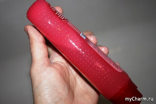 Сказать, что флакон нарядный, это ничего не сказать. Малиновое пластиковое чудо по всей торцевой части имеет широкий ряд пупырышек. Это позволяет свободно держать шампунь даже в мыльных руках. А внешне, лично мне он напоминает детский прорезыватель для зубов.