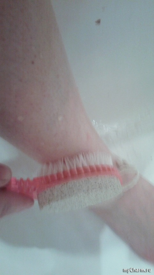Поэтому я нашла альтернативу - эта жесткая щетка на пилке для ног Орифлейм, во время душа наношу гель на эту щетку и начинаю массажными движениями снизу вверх чистить кожу ног.