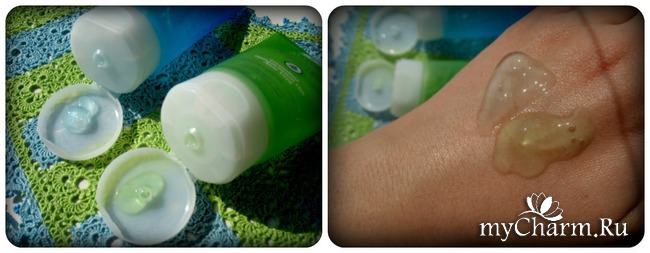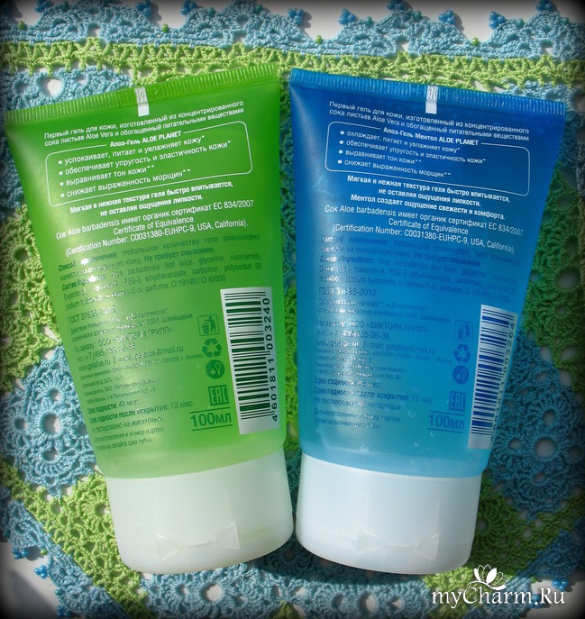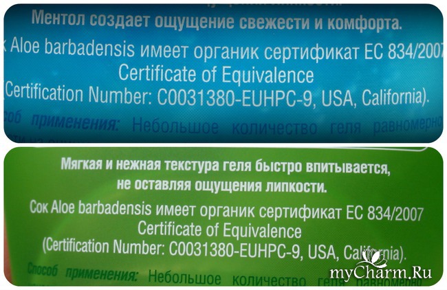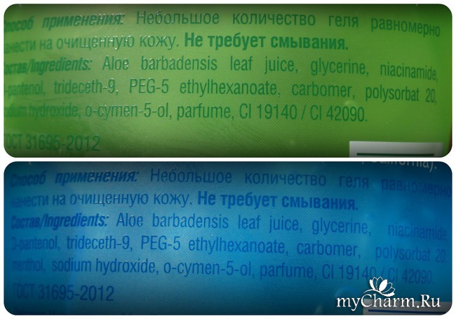 Гель зеленого цвета - увлажняющий, а синего - охлаждающий, т. к. в составе содержится ментол.