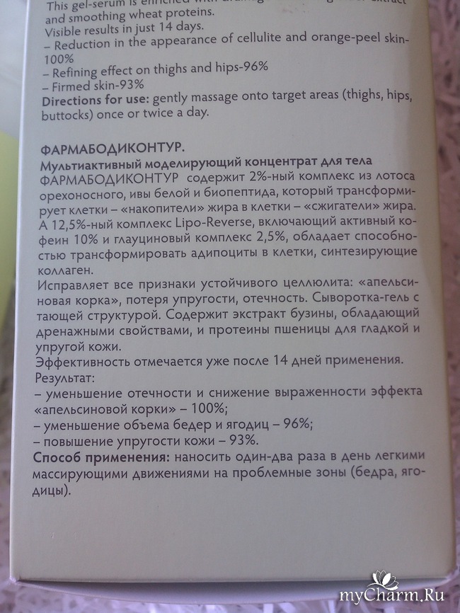 Средство ФАРМАБОДИКОНТУР очень приятное в использовании. Имеет приятный, освежающий аромат и легкую структуру. При нанесении легко распределяется по коже и впитывается. После использования ощущается упругость кожи, выравнивается рельеф, целлюлитная корка становиться менее выражена и менее заметна, тело становиться подтянутым.