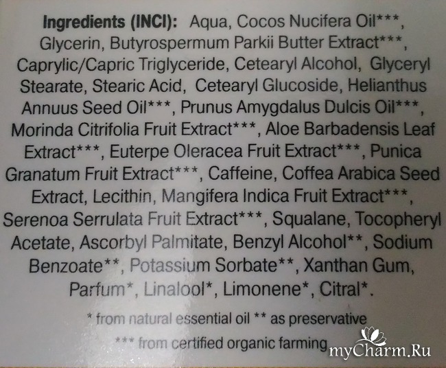 Это, во-первых, ценные масла для питания и лифтинга кожи – ши, миндаля, кокоса. Это сок нони – короля фруктов, лидера по количеству антиоксидантов. Это такие признанные в косметологии экстракты, как алое, ягоды асаи, граната, пальмы карликовой. Это кофеин – основной компонент антицеллюлитных средств – благодаря его способности бороться с дряблостью кожи и апельсиновой коркой. Это множество витаминов (Е, С и др).