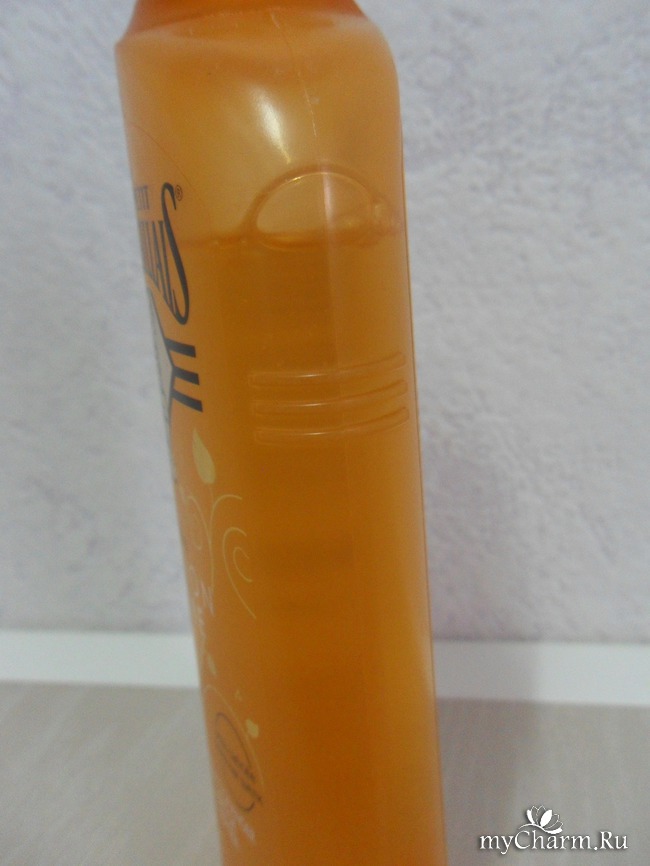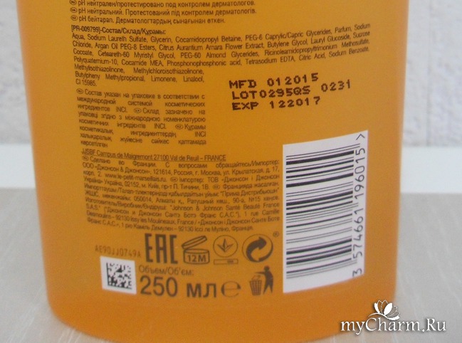 Я привыкла к не прозрачным флаконам этой марки. У этого геля он сделан из просвечиваемого оранжевого пластика, благодаря чему легко прослеживаешь его объем. Да и форма флакона отличается от прежних. Информация о продукте приведена на французском и русском языках.