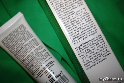 Красивая коробочка с нежным изображением листьев алоэ запаяна в прозрачную пленку. Можно быть уверенной, что никто до вас не вскрывал её и не пробовал само средство. Здесь имеется основное описание действия продукта, состав, срок годности и данные о компании. Никаких рекламных слоганов и громких обещаний. Все сдержано и лаконично. Кстати хранится пилинг 2 года.