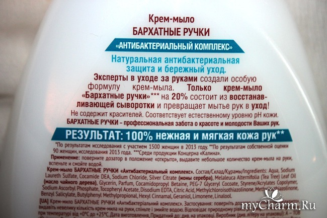 Крем-мыло очень мило оформлено. Полупрозрачный белый пластиковый флакон каплевидной формы с изгибами и переходами. Все в пастельных тонах. На лицевой стороне прозрачная наклейка с изображением бело-голубого цветка, напоминающего лилию или лотос. В составе указаны масло чайного дерева и ионы серебра, которые, видимо, и отвечают за антибактериальный эффект. Ведь, согласно лабораторным исследованиям, ионы серебра способны уничтожать более разновидностей патогенных микробов, вирусов и грибков. Для человека это является защитой от простудных аденовирусов, гриппозных заболеваний и кишечных инфекций. Наличие восстанавливающей сыворотки (не менее 20%) обеспечивает увлажнение и восстановление кожи. Клапан-дозатор телесного цвета вполне чувствительный, т. е. можно легким нажатием выдавить и каплю и объемную лужицу. Таким образом, всегда можно контролировать расход средства.