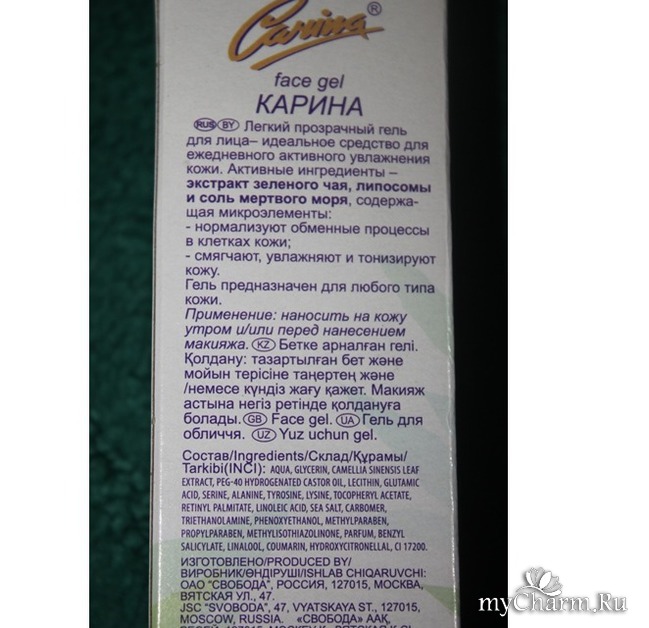 Как и основная часть представленных Свободой кремов, гель Карина упакован в коробку. На ней изображена зелень и цветы. Также казано, что гель содержит комплекс аминокислот и микроэлементов.