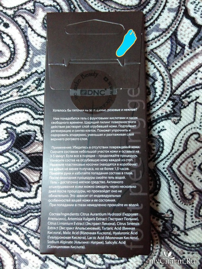 Описание пилинга очень привлекательное: производитель обещает мягкое очищение кожи ног от омертвевших клеток. В то же время проговаривается, что средство может и вовсе не подействовать, все зависит исключительно от особенностей кожи. Во избежание аллергических реакций, производитель рекомендует нанести средство на небольшой участок кожи и подождать некоторое время. Если неприятных ощущений нет – смело можно намазать пилинг на всю кожу ступней.
