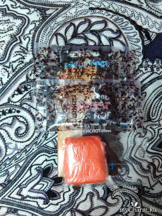 Внутри оказались вот такие богатства: 2 обещанных пакетика с гелем с фруктовыми кислотами и носочки для проведения процедуры пилинга.