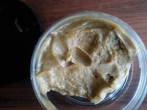 Средство в ней зеленого цвета, запах мятный - "Мохито", распределено в баночке неравномерно, оно не жидкое, немного мягкое - след от пальцев остается - сказала бы, что напоминает сливочное масло, но без характерной для него жирности.