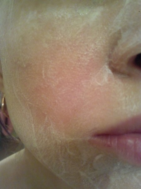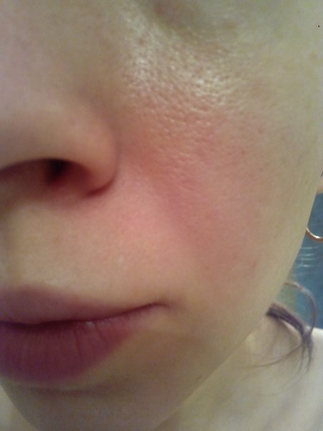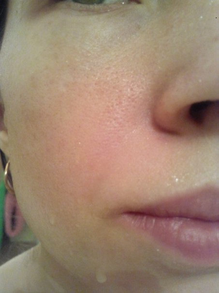 Воспользовалась спонжиком для умывания, умыла лицо с помощью них, чуток потерла в местах, где у меня поры, и смыла. На фото видно, что некоторые места покраснели. Поры чуток стянулись, после того как умыла водой, но этот эффект достаточно быстро исчезает. Но главное, что кожу чистит. После того, как смоешь мыло, присутствует ощущение, будто кожа скрипит.