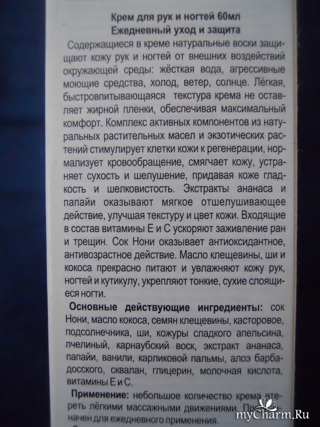 В креме для рук, содержится натуральные воски, которые помогают защитит нашу кожу рук и ногтики о негативного воздействия внешних факторов. Для меня - это просто чудо какое-то! Я допустим, не могу мыть посуду в перчатках, поэтому моющее средство довольно хорошо сушит кожу, да и стираю я вещи некоторые руками. И вот именно после всех этих женских дел, когда кожа пересушена порошками и моющими средствами - это спасение! Главные ингредиенты крем - экстракт папайа и ананаса, оказывают отшелушивающее действие, очень хорошо увлажняют кожу и при этом не оставляют пленки на коже.