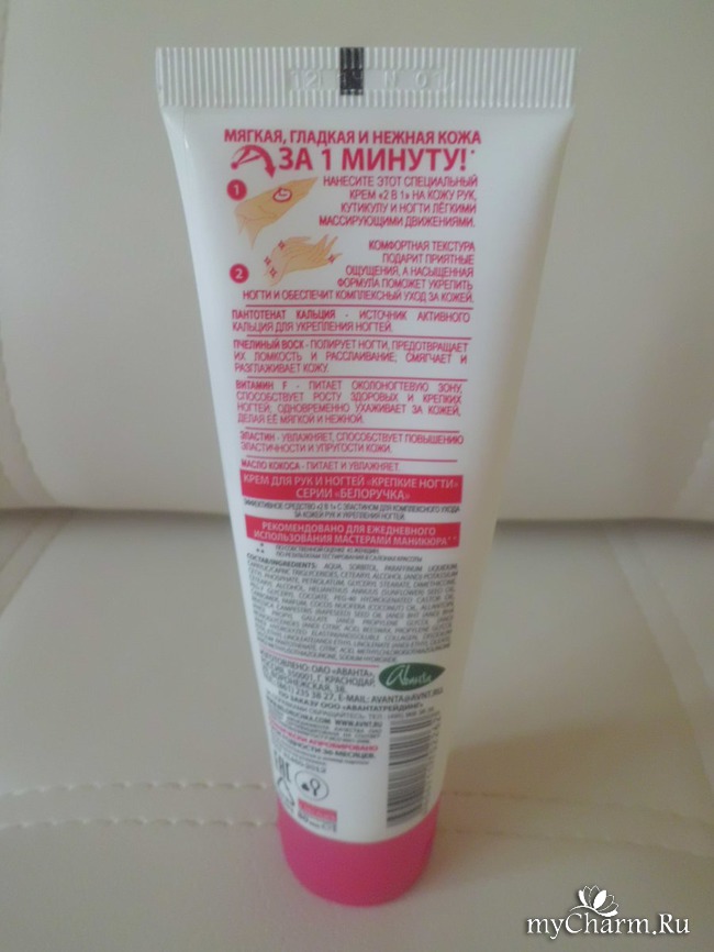 Производитель обещает красивые крепкие ногти и мягкую ухоженную кожу. В составе крема есть натуральные ингредиенты: пчелиный воск, масло кокоса, а также витамин F, пантотенат кальция и эластин. Это значит, что у крема не только хорошая упаковка, но и привлекательный состав.