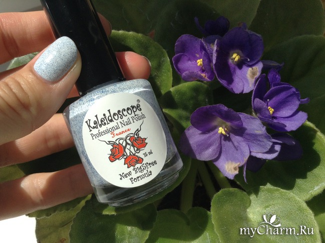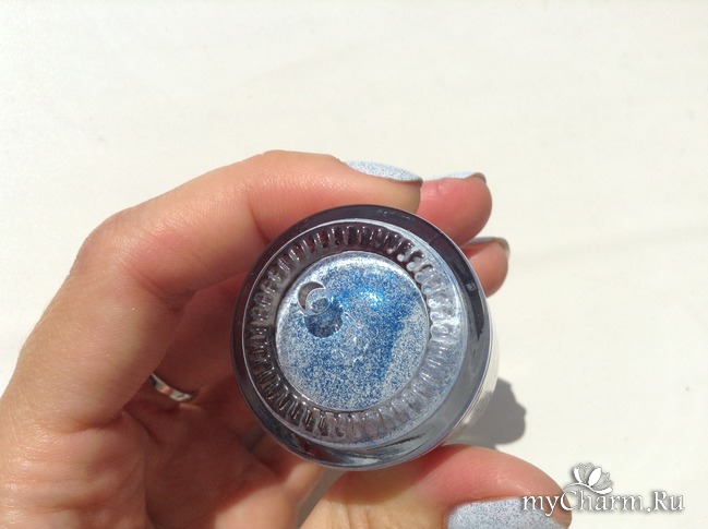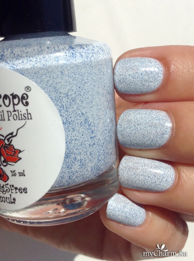 Довольно лаконичный пузырек объемом 15 мл и достаточно удобной кисточкой. Разбеленый голубой цвет с мелким синим шиммером, который переливается в стекле и выглядит матево-глянцево на ноготках.