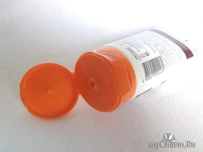 Косметическое средство находится в пластиковой тубе, которая закрывается крышкой с дозатором. Площадь крышки широкая, что удобно в использовании и хранении. Опираясь на крышку тюбика, мой помощник занял свое почетное место на полочке с косметикой.