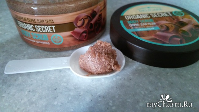 Открыв защитную фольгу, любая сладкоежка сойдет с ума от блаженства и запаха данного средства. Кажется, что вы открыли не скраб для тела, а какую-то шоколадную смесь, которую так и хочется попробовать.