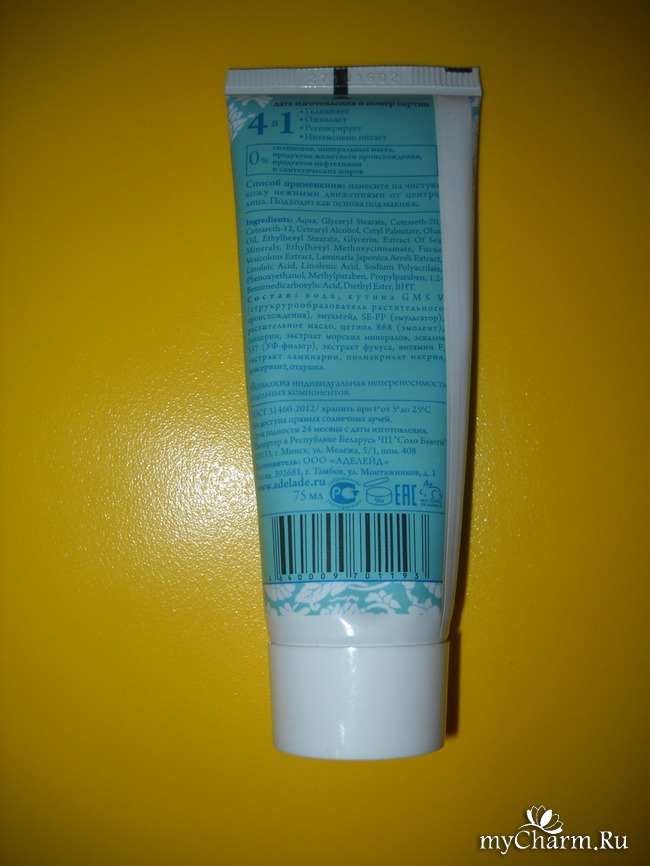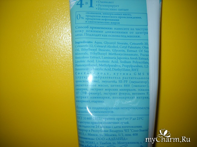 На обратной стороне можно найти массу полезной информации. Во-первых, здесь мы можем четко увидеть, что данный крем – это не просто крем, а средство 4 в 1, которое увлажняет и оживляет, а также регенерирует и интенсивно питает кожу. А еще этот превосходный крем помогает замедлить процессы старения, что тоже очень важно для каждой женщины! Во-вторых, производитель спешит порадовать нас благой вестью о том, что в составе крема не удастся найти ни продуктов животного происхождения, ни минеральных масел, ни силиконов, ни синтетических жиров или продуктов нефтехимии. В-третьих, здесь же указаны все необходимые контактные данные производителя, сведения о сроке годности, который составляет два года с момента производства крема, об условиях хранения (хранить данное средство следует, исключив доступ прямых лучей солнца, при температуре от пяти до двадцати пяти градусов) и, конечно же, о составе.