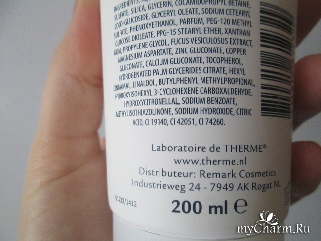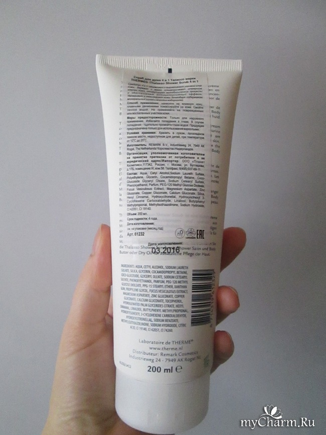 Скраб содержит (как и вся линия Талассо в Терме) экстракты водорослей и минералы Мертвого моря и Атлантического океана. Все мы знаем, как они полезны для кожи тела и лица. Скрабом этим можно даже, по моему мнению, очищать кожу лица, не только тела.