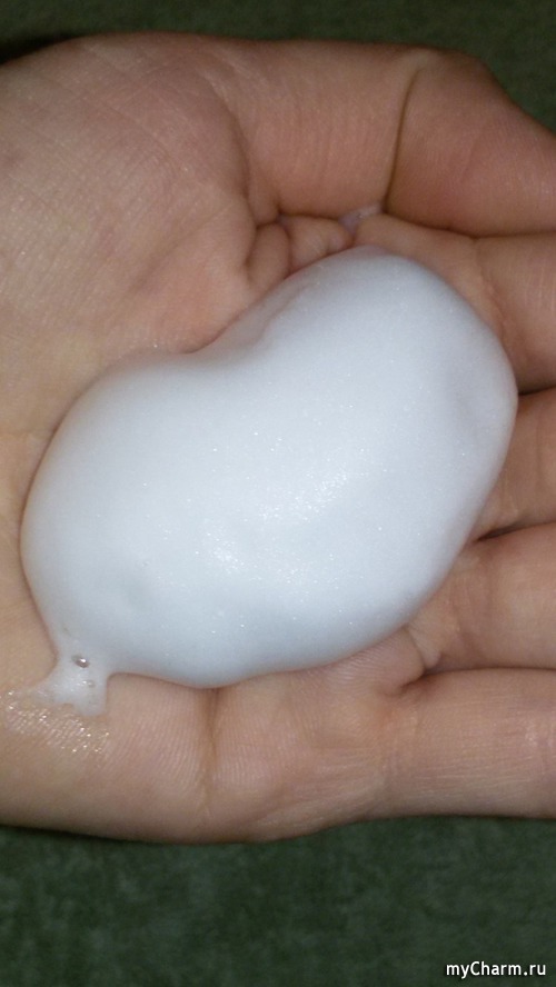 Распылитель у средства вполне удобный, но мне встречались и помягче для более плавного и дозированного выдавливания. Содержимое по консистенции напоминает густую пенку, но пышнее и с более мелкими порами. После на ладони ощущается липкость, которую легко смыть обычной водой.
