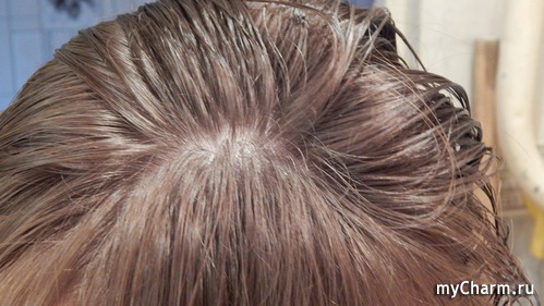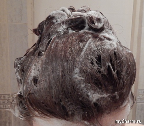 Шампунь, как обычный, налила на ладони, растерла в пену и нанесла на влажные волосы.
