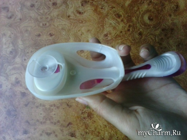 Сам станок был упакован в коробку, которую я еле распечатала. Сейчас станок находится на вот такой подставке. В комплект также входил чехольчик на кассету. Очень практично если, допустим, брать её с собой куда-то.На подставке есть вот такая силиконовая присоска, благодаря которой можно ее легко прикрепить куда угодно на вертикальную поверхность в ванной комнате. Я считаю - это очень удобно! У себя прикрепила на стену, присоска очень хорошо держит!