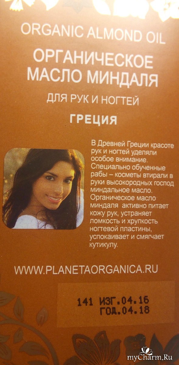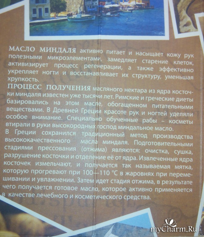 Слева есть текст о пользе миндаля для рук, из которого мы узнаем о том, что микроэлементы, содержащиеся в масле, питают кожу, замедляют старение, регенерируют, укрепляют ногти, восстанавливают структуру, уменьшают хрупкость ногтевой пластины.