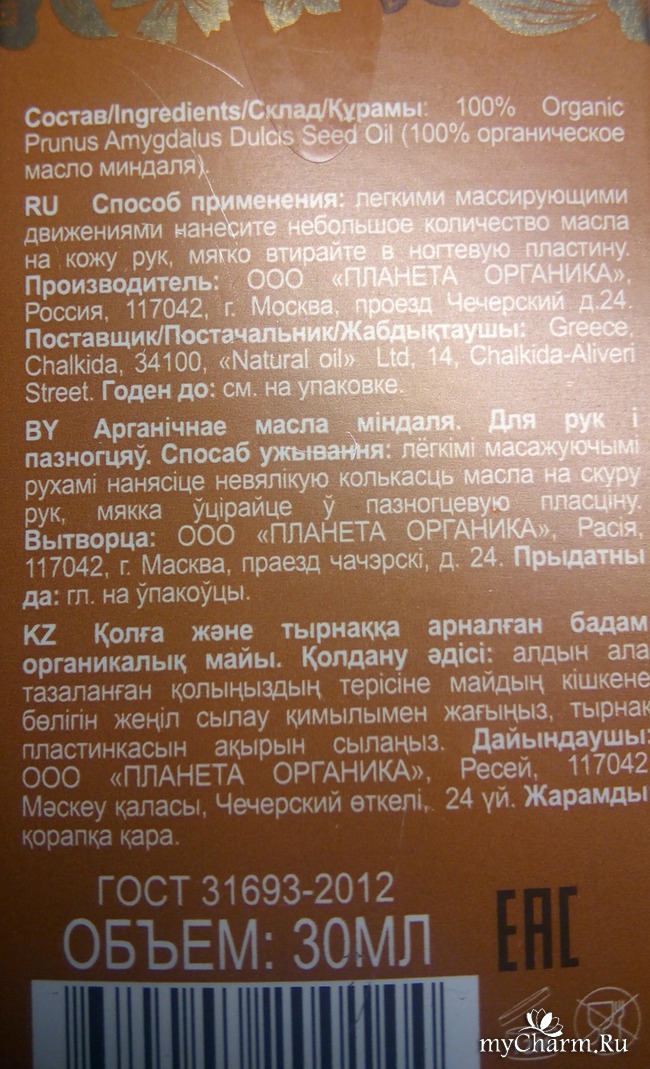 Здесь же уделю внимание составу. Он очень короткий, а точнее, в нем всего один компонент! 100 % органическое масло миндаля. Все, а нам больше и не надо!
