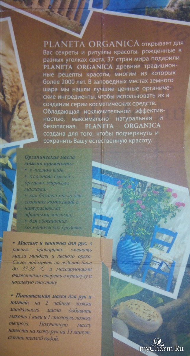 Справа, на внутренней стороне упаковки, есть краткая информация о команде планеты органик. Ниже говорится о способах применения масла, и даже приведено для примера два рецепта изготовления ванночки и маски для рук.