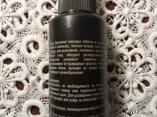 Состав прост: гидролат можжевельника и вещества, помогающие его сохранить (в противном случае срок годности подобных средств очень короток).