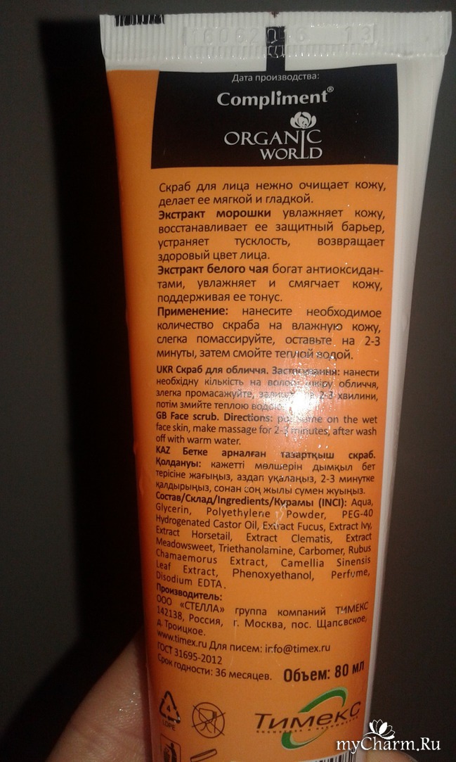 Сразу написано, что скраб без силиконов и парабенов. И это радует! Далее, на обратной стороне, видим описание, состав, срок годности, обьем скраба: